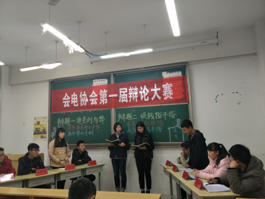 为丰富大学生的课余生活,活跃校园文化氛围,培养当代大学生的团结、竞争、进取的精神,我系会计电算化协会于12月23日在4018教室成功举办了大学生辩论赛。